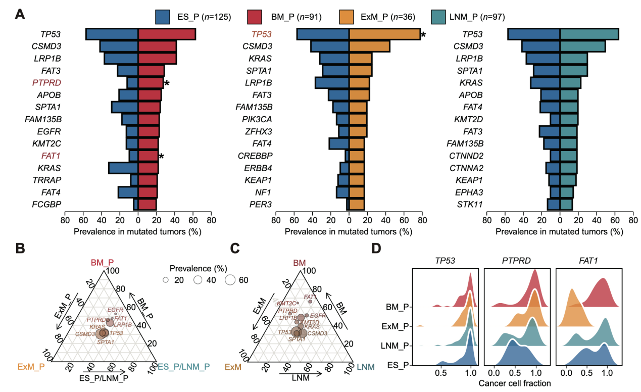 结果显示,原发与配对转移灶的肿瘤驱动突变总体高度一致,但有趣的是,与未转移的早期原发肿瘤相比,肺癌脑转移配对的原发肿瘤中富集PTPRD、FAT1等突变基因(图2A),且在原发阶段即呈更高的突变克隆性(图2B-D),提示这些驱动基因可能在转移启动前已赋予器官转移趋向性。