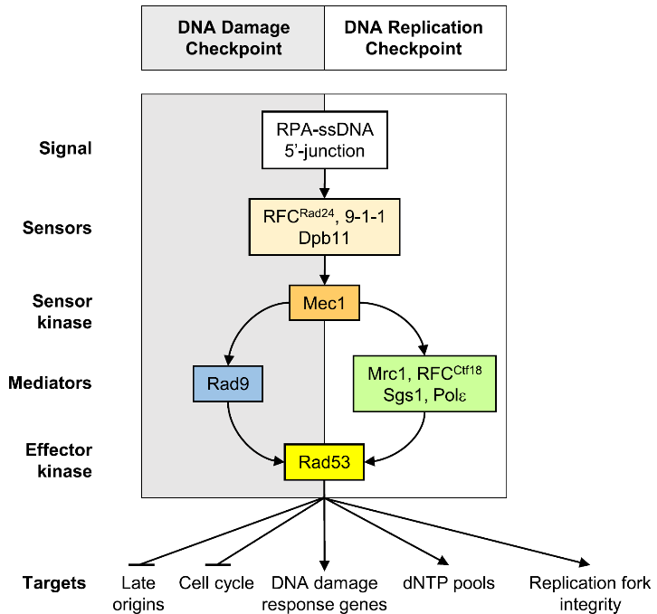 图 1 DNA损伤检验点通路与DNA复制检验点通路示意(2016, FEMS Yeast Research)