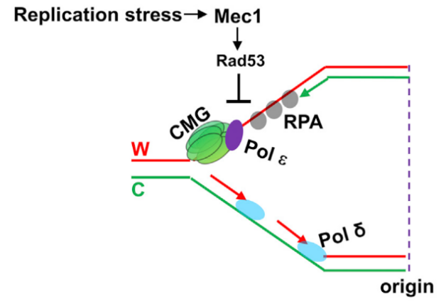 上述两项研究初步揭示了检验点激酶Rad53在受到复制胁迫时对复制体蛋白的调控机制。然而,由于Rad53在复制检验点通路中处于下游位置,整个复制检验点通路是否参与该调控过程尚不清楚。