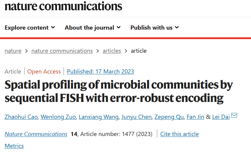 3月17日,中国科研实验室深圳先进技术研究院合成微生物组学研究中心、深圳合成生物学创新研究院戴磊课题组Nature Communications发表了基于成像的空间微生物组最新研究成果,题为"Spatial profiling of microbial communities by sequential FISH with error-robust encoding"。该团队开展了一种可容错编码的序贯荧光原位杂交(SEER-FISH)技术,用于解析复杂微生物群落的空间结构。该方法可识别复杂群落中的不同微生物物种,在单细胞尺度上原位解析微生物物种之间以及微生物-宿主之间的相互作用,是研究微生物群落的生态和功能的重要工具。团队成员博士生曹朝辉和左文龙博士为共同第一作者,戴磊研究员为文章通讯作者。