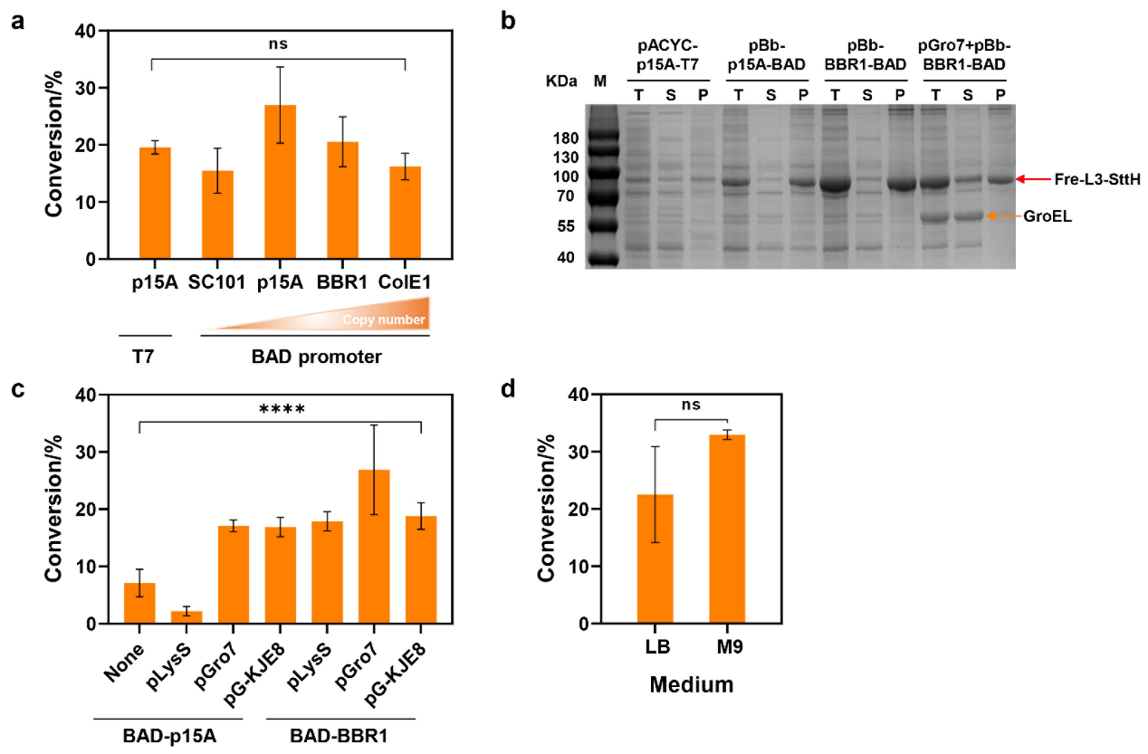 a. Fre-L3-SttH融合酶在T7或BAD启动子控制下的表达载体优化。b.不同构建的Fre-L3-SttH的可溶性表达水平。箭头分别指示Fre-L3-SttH(红箭头)和GroEL(橙箭头)的表达。通M表示蛋白分子量标记;T表示全菌;S表示上清。c. BAD-p15A和BAD-BBR1表达载体中Fre-L3-SttH融合酶与不同分子伴侣共表达的优化。d.培养基的优化