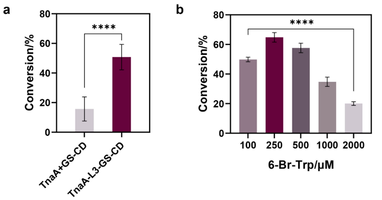 a. 共表达TnaA和GS-CD或利用双功能酶TnaA-L3-GS-CD时,Tyrian purple的转化率。 b. 体内反应中利用TnaA-L3-GS-CD 以6-Br-Trp为底物时,Tyrian purple的转化率