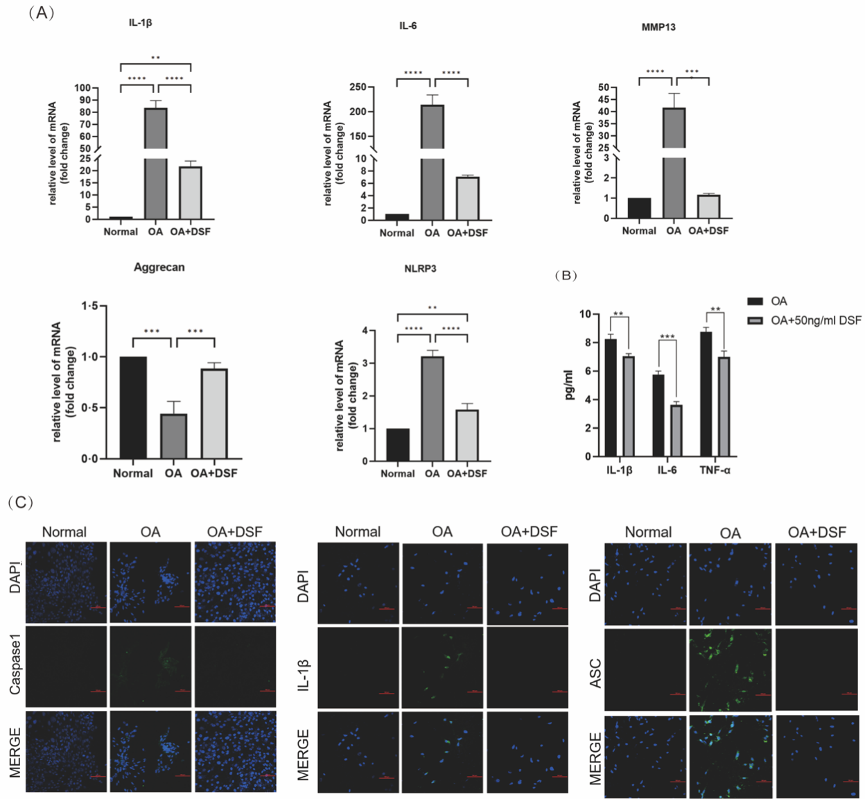 为了克服这一难题,研究者们第一时间评估了 DSF的细胞毒性,发现其在100 ng/mL 浓度以下没有明显的细胞毒性,且对软骨细胞在促炎因子白介素-1(IL-1 )刺激下具有保护效果。此外,DSF显著抑制了促炎细胞因子IL-1 , IL-6, MMP13等的表达(图1)。
