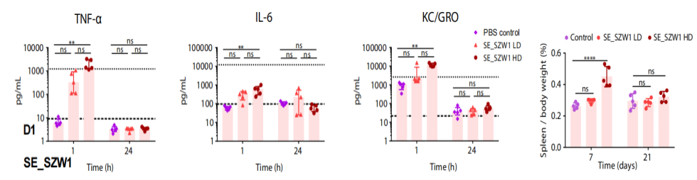 后续的研究发现噬菌体SE_SZW1可激活机体部分炎症因子的上调表达(图3)。同时,在高剂量组中,研究团队也观察到脾脏脏器系数升高(图3)。这些结果提示噬菌体可激活机体非特异性免疫反应而导致血浆噬菌体加速清除。