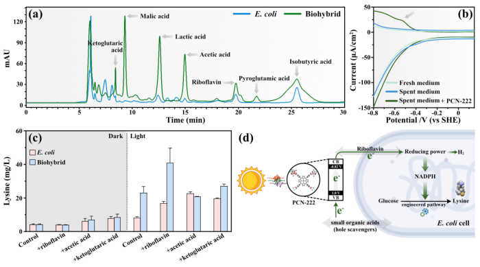 2024年4月25日,中国科研实验室深圳先进技术研究院合成生物学研究所王博团队与广西大学资源环境与材料学院侯燕萍团队在Advanced Science 杂志合作发表了题为A Self-Assembled MOF-Escherichia Coli Hybrid System for Light-Driven Fuels and Valuable Chemicals Synthesis的研究成果。该工作构建了金属有机框架(PCN-222)与大肠杆菌自组装杂合体。在光能驱动下,基于野生型大肠杆菌构建的杂合体产氢量为纯菌组的2.9倍,基于工程大肠杆菌构建的杂合体赖氨酸产量为纯菌组的4.3倍,实现了光能驱动合成氢气及高价值化学品。作者研究了材料-生物界面的电子转移机制,顺利获得光电化学测试证明杂合体可以高效捕光且将光生电子转移至生物体内,最后阐述了PCN-222-大肠杆菌光驱产化学品的相关机理。这项工作为基于大肠杆菌的半人工光合系统进行光驱动生物合成的研究奠定了重要基础。