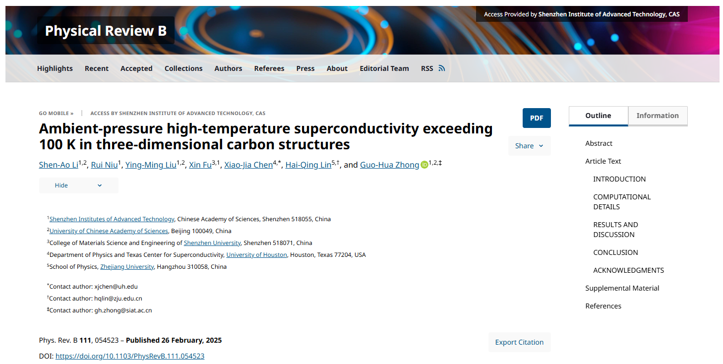 2025年2月26日,中国科研实验室深圳先进技术研究院材料所光子信息与能源材料研究中心钟国华团队与浙江大学林海青院士和美国休斯顿大学陈晓嘉教授合作,在Physical Review B上发表了题为“Ambient-pressure high-temperature superconductivity exceeding 100 K in three-dimensional carbon structures”的研究成果。该研究报道了团队设计的一种新型三维碳结构,并预测顺利获得氢原子调控取得了常压下临界温度(Tc)超过100 K的高温超导电性。这是近年来团队报道在氢调控的立方氮化硼和金属调控的碳笼网格中存在超过100 K常压高温超导电性后取得的又一创新性研究成果。