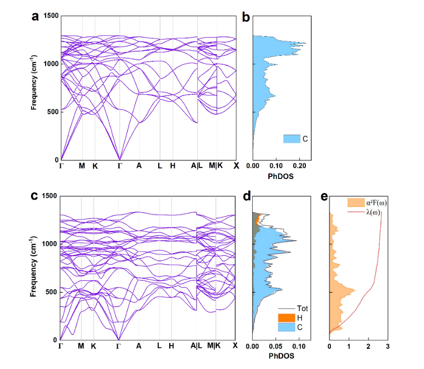 声子和超导参数:纯碳结构的声子谱和声子态密度(上)、HC6的声子谱、声子态密度和电声耦合参数(下)