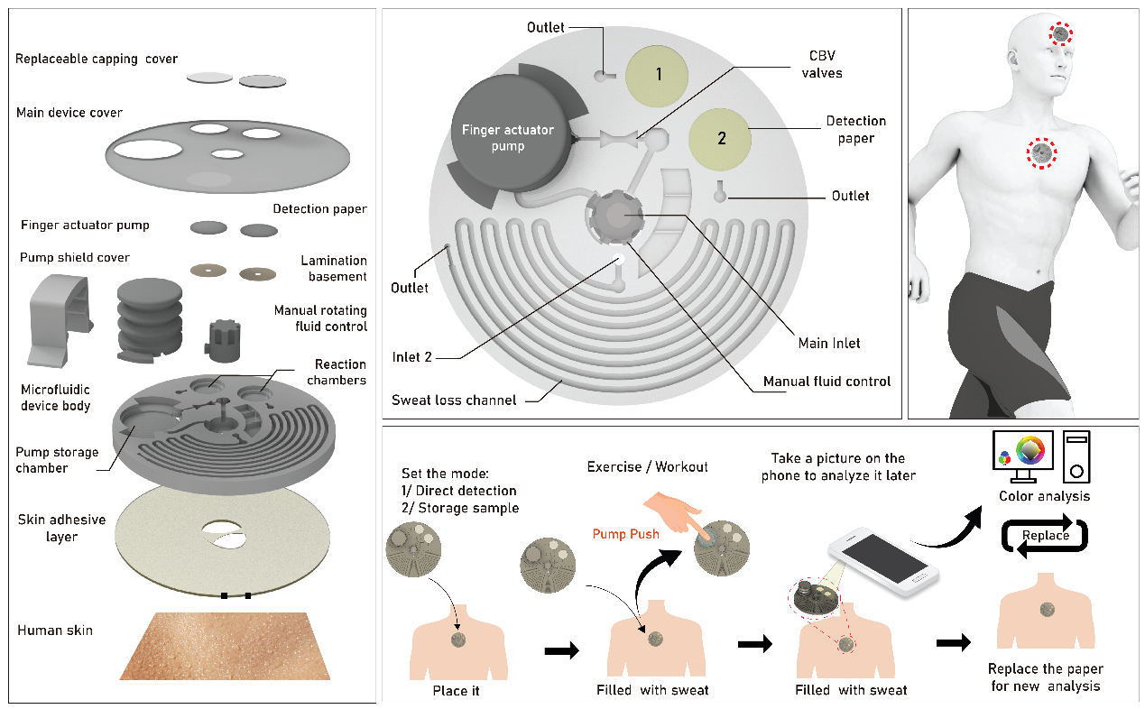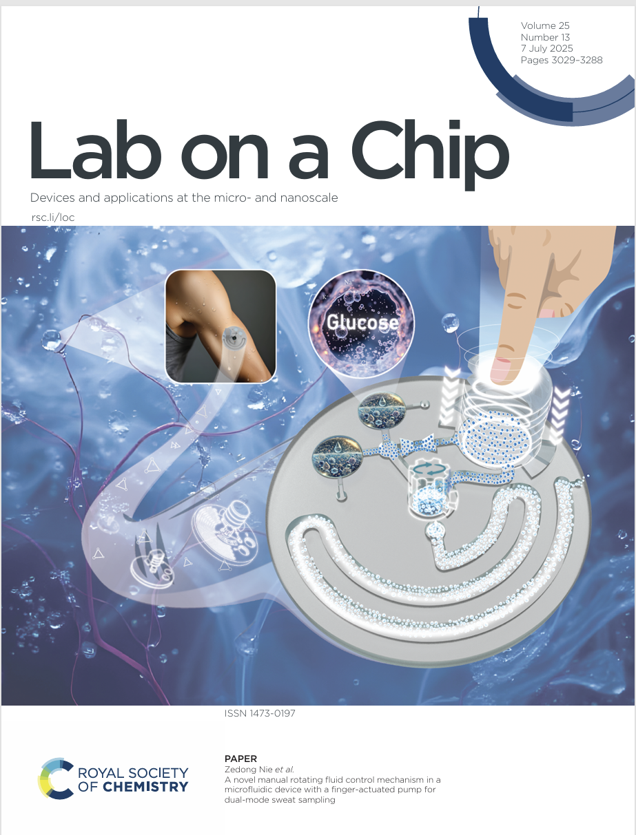 中国科研实验室深圳先进技术研究院聂泽东研究员团队在国际著名期刊Lab on a Chip上发表了题为" A Novel Manual Rotating Fluid Control Mechanism in a Microfluidic Device with a Finger-Actuated Pump for Dual-Mode Sweat Sampling " 的封面论文,介绍了一种新型可穿戴微流控系统,能够实现精确的双模式汗液收集和葡萄糖生物标志物检测。