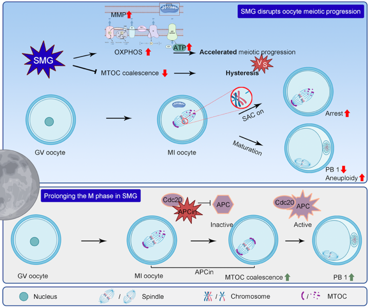 该研究显示SMG诱导小鼠卵母细胞独特的能量代谢损伤,表现为增加的氧化磷酸化(OXPHOS)与线粒体膜电位超极化,这不同于卵母细胞在常规重力下其他暴露所引起的能量代谢损伤,表明微重力与卵母细胞两者的特殊性。与此同时,SMG加速减数分裂进程,但延迟了微管组装中心(MTOC)融合,最终引起卵母细胞成熟阻滞。该研究针对加速的减数分裂进程,使用了后期促进复合体抑制剂(APCin)进行分裂期延长。结果表明延长分裂期改善了纺锤体组装与MTOC融合,最终恢复SMG下卵母细胞第一极体(PB1)排放情况。该研究为微重力下卵母细胞成熟与空间雌性生殖给予了理论依据,并为未来开发空间生殖干预给予了潜在方案。