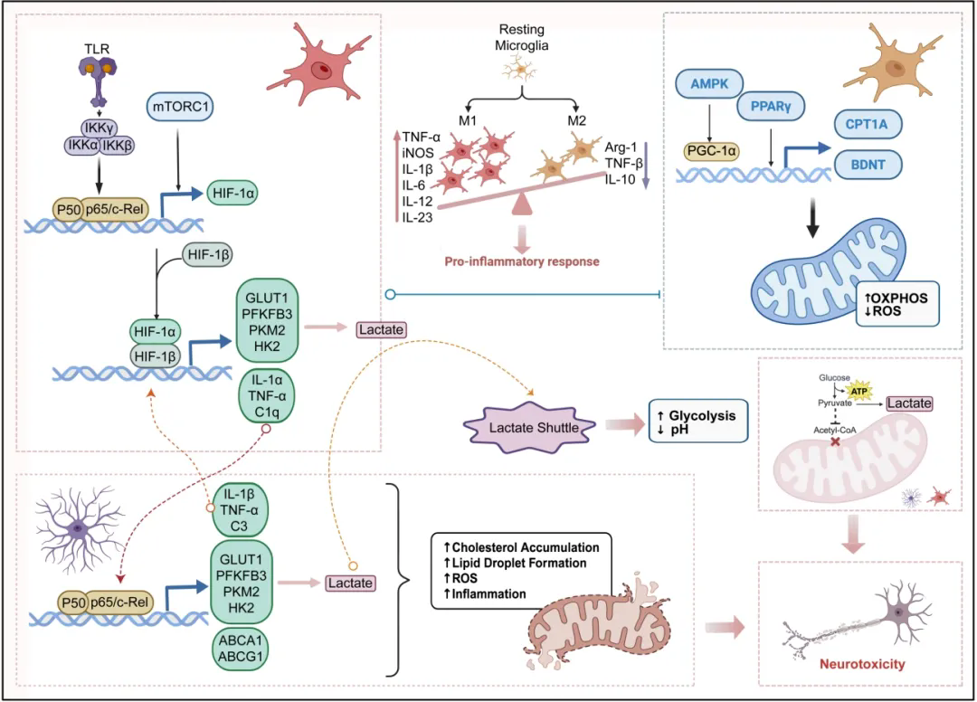 在小胶质细胞中,炎症激活往往伴随显著的代谢重编程。正常情况下,它们更多依赖氧化磷酸化(OXPHOS)维持稳态;而在病理刺激下,小胶质细胞会转向以糖酵解为主的能量代谢模式。这种转变并不仅仅是供能方式变化,更会直接有助于炎症介质释放、活性氧(ROS)积累以及促炎信号持续激活,从而加重局部神经损伤。综述进一步指出,这种代谢状态变化广泛存在于阿尔茨海默病、帕金森病、多发性硬化、卒中及缺氧缺血性脑损伤等多种疾病背景中。